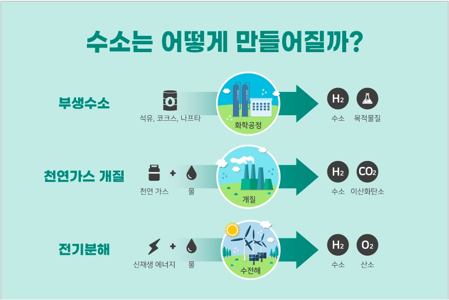 다만 수소는 주로 물, 천연가스 등 화합물 형태로 결합돼 있기에 이를 따로 추출하는 작업이 필요하다. 이 작업에 어떤 에너지를 사용하느냐에 따라 브라운(석탄 에너지), 그레이(천연가스), 그린(재생에너지), 핑크(원자력에너지) 등으로 분류하기도 한다.