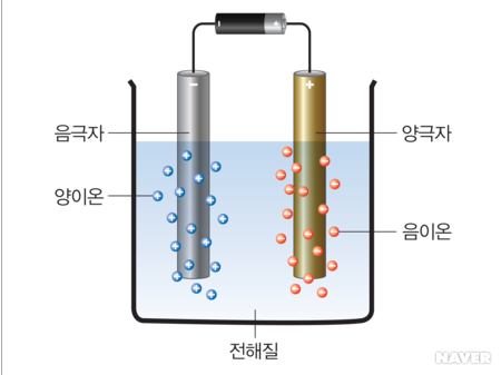 전해질에 음극자와 양극자를 넣고 전기에너지를 가하여 각 극자에 양이온, 음이온이 나뉘며